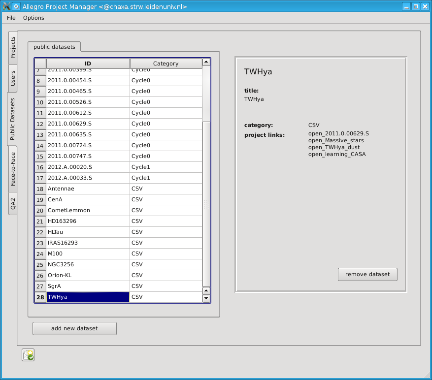 The QA2 projects tab gives you some information about the QA2 projects that were done at Allegro. Projects get registered automatically when running the qa2_* scripts (See the appropriate section in the AllegroGuide). Therefore, there is no interaction necessary. The QA2 project database is in $ALLEGRO_DB/qa2_archive, where each QA2 project is a separate csv-file.