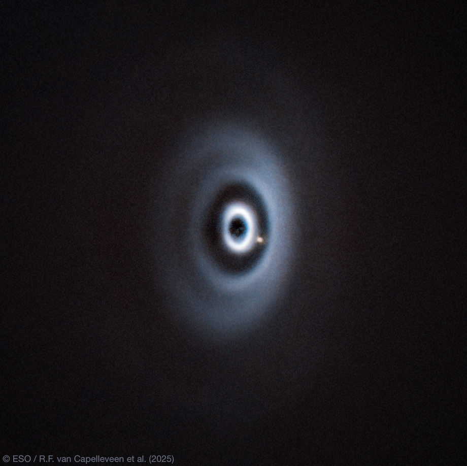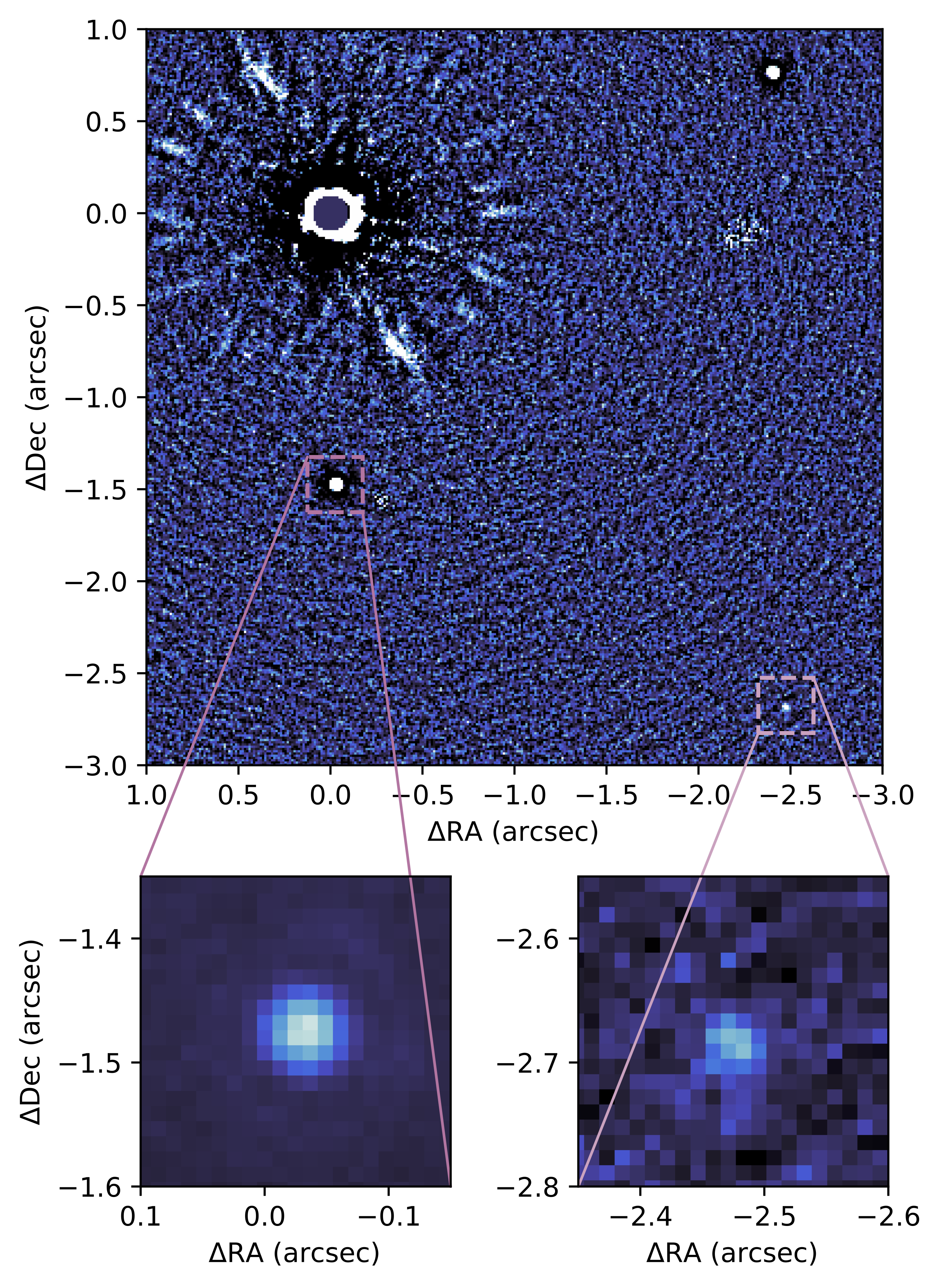 WISPIT 1, located behind the coronagraph in the upper left corner of the unsharp masked observation shown in the top panel of the figure, is a young ~16 Myr system approximately 229 parsecs away. It is a binary with a solar-type primary, and hosts two comoving planetary mass companions at large semimajor axes.