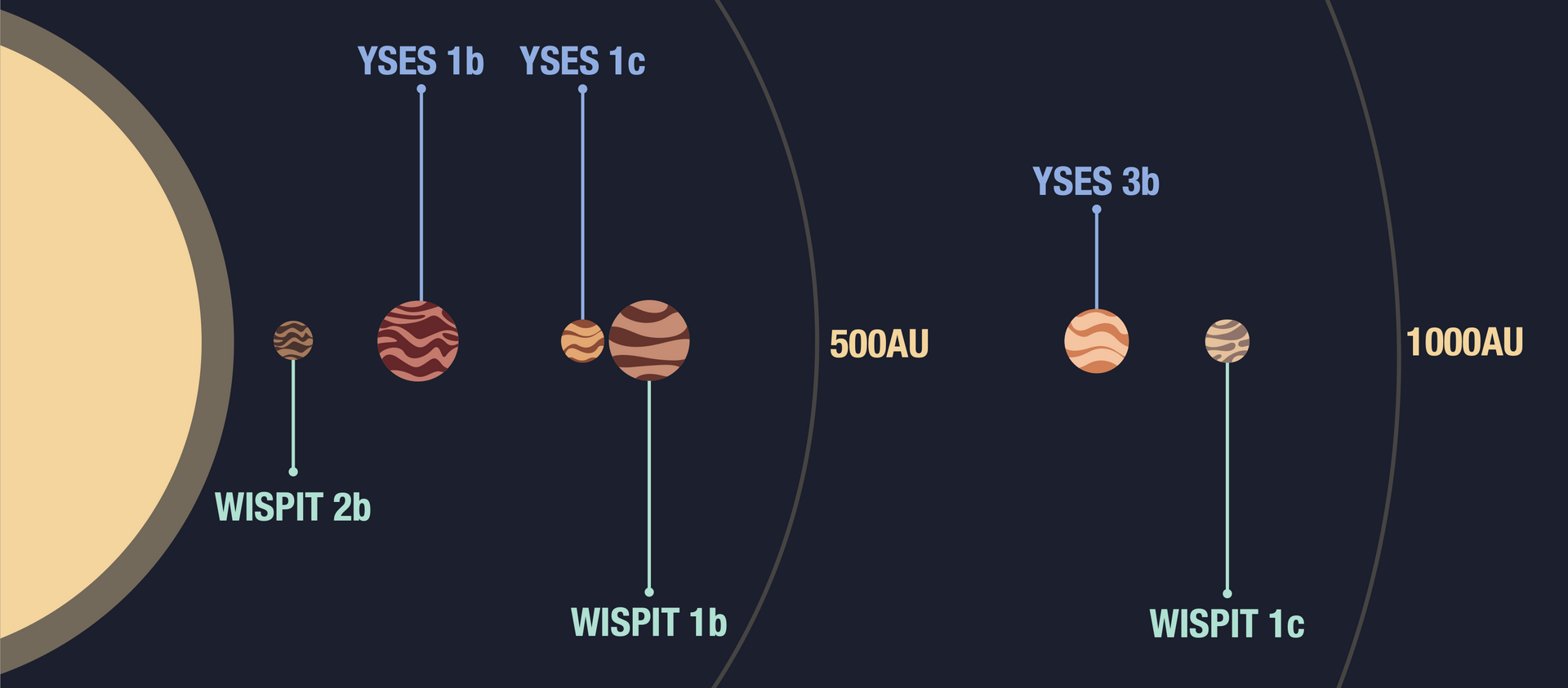WISPIT 1c, shown in the lower right panel of the figure, is a ~5 Jupiter mass planet orbiting at a projected separation of at least 840 au, making it among the widest separation directly imaged planets to date.