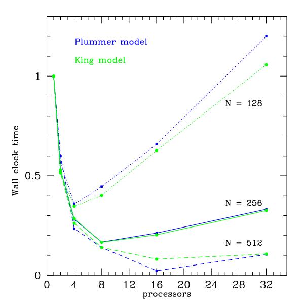 Small timing test (perfomed by A. Gualandris) for 128, 256 and 512 particles with up to 32 processors on the Blue (Boewulf) linux cluster at SARA.